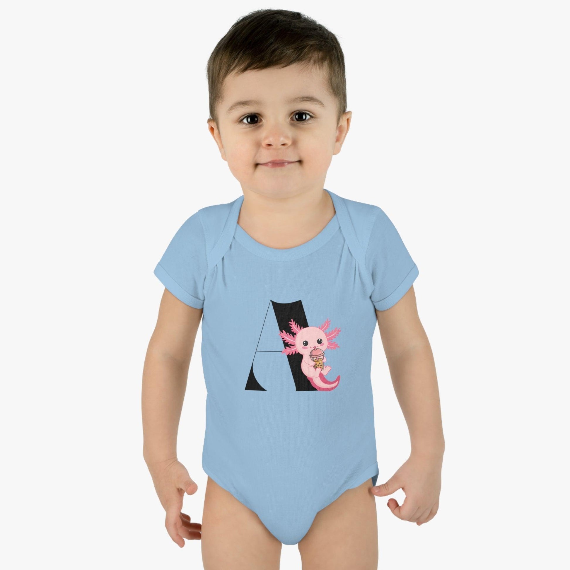 Embark on an exciting journey through the alphabet with this adorable "Alphabet Adventures: A is for Axolotyl" onesie! This delightful design features a cute axolotl leaning against a giant letter A while sipping on a refreshing boba tea. Perfect for curious little ones, this onesie sparks a love for learning and appreciation for these fascinating creatures.