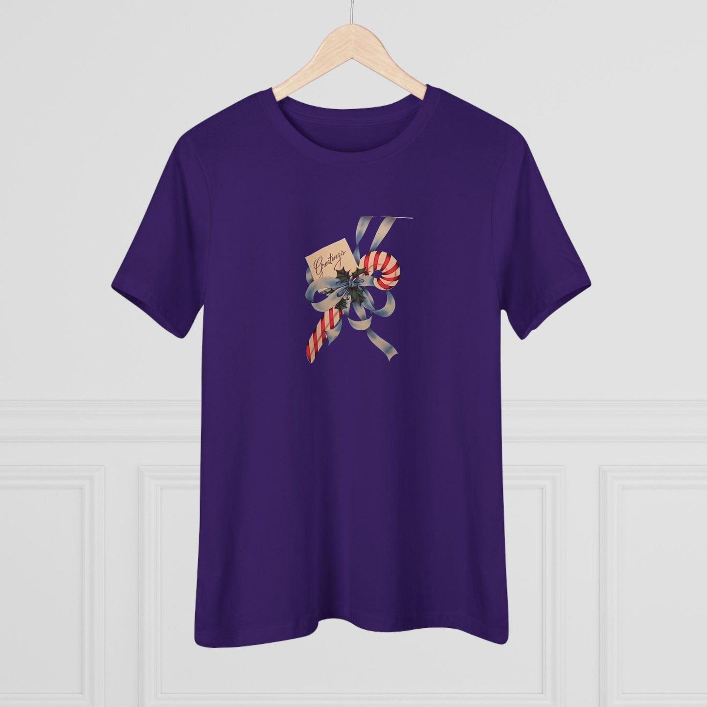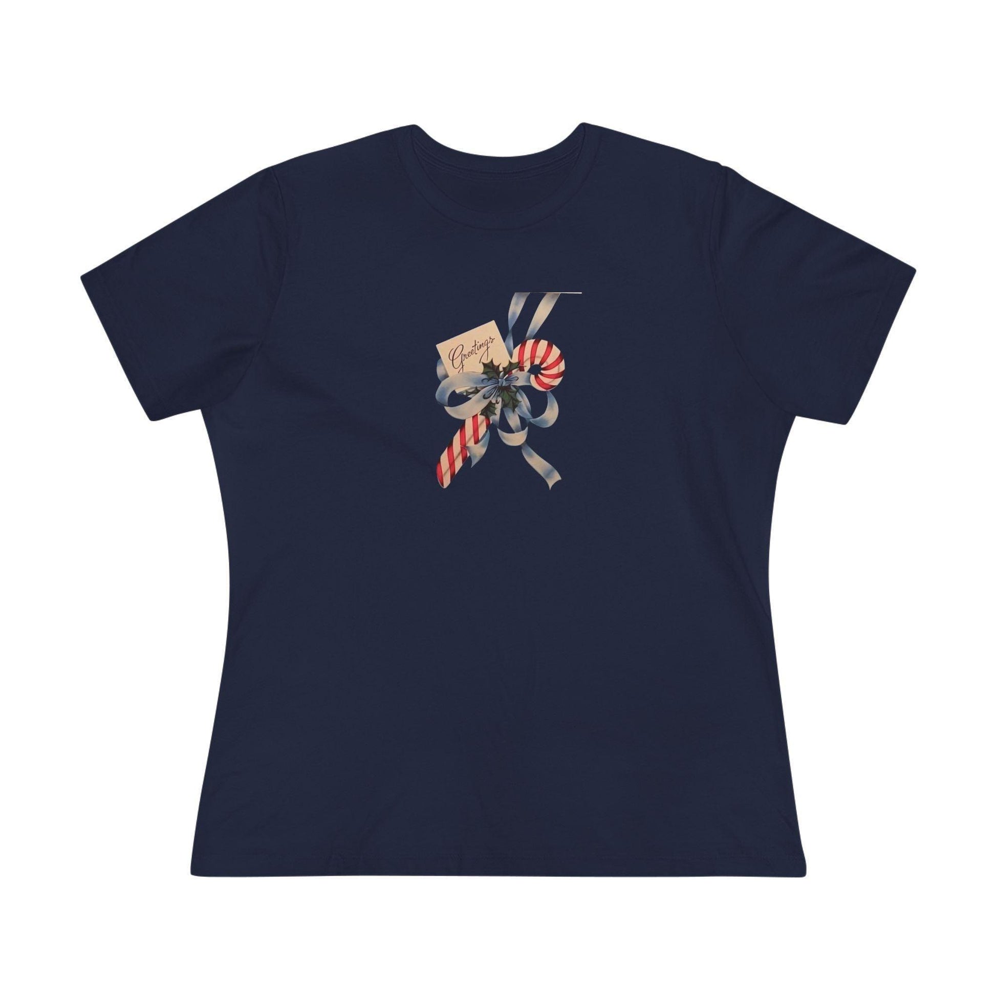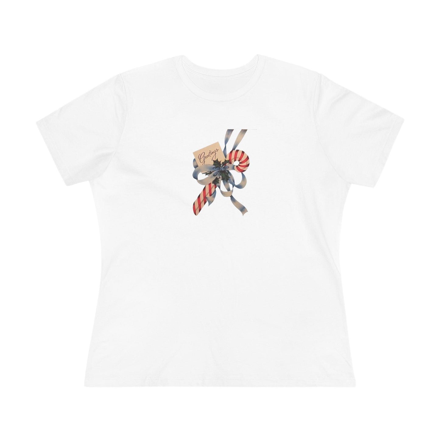 Spread holiday cheer with this festive Candy Cane "Greetings" Women's Softstyle T-shirt. This comfy tee features a classic candy cane design with the word "Greetings" for a touch of holiday spirit. Made from soft, lightweight material, it's perfect for holiday parties, casual outings, or cozy nights at home.