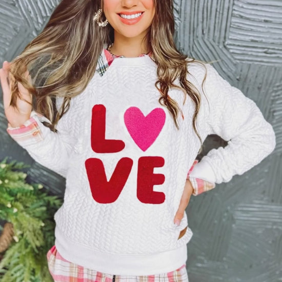 Cozy, versatile, and effortlessly stylish, this Chenille Cable Knit Sweatshirt is designed for everyday comfort with a touch of seasonal charm. Featuring a beautifully textured cable knit pattern and soft chenille embroidery, this sweatshirt blends warmth and personality in a relaxed pullover silhouette. With multiple embroidered design options available, including LOVE, XOXO, and other festive favorites, this sweatshirt allows you to express your style while staying comfortable all day long.