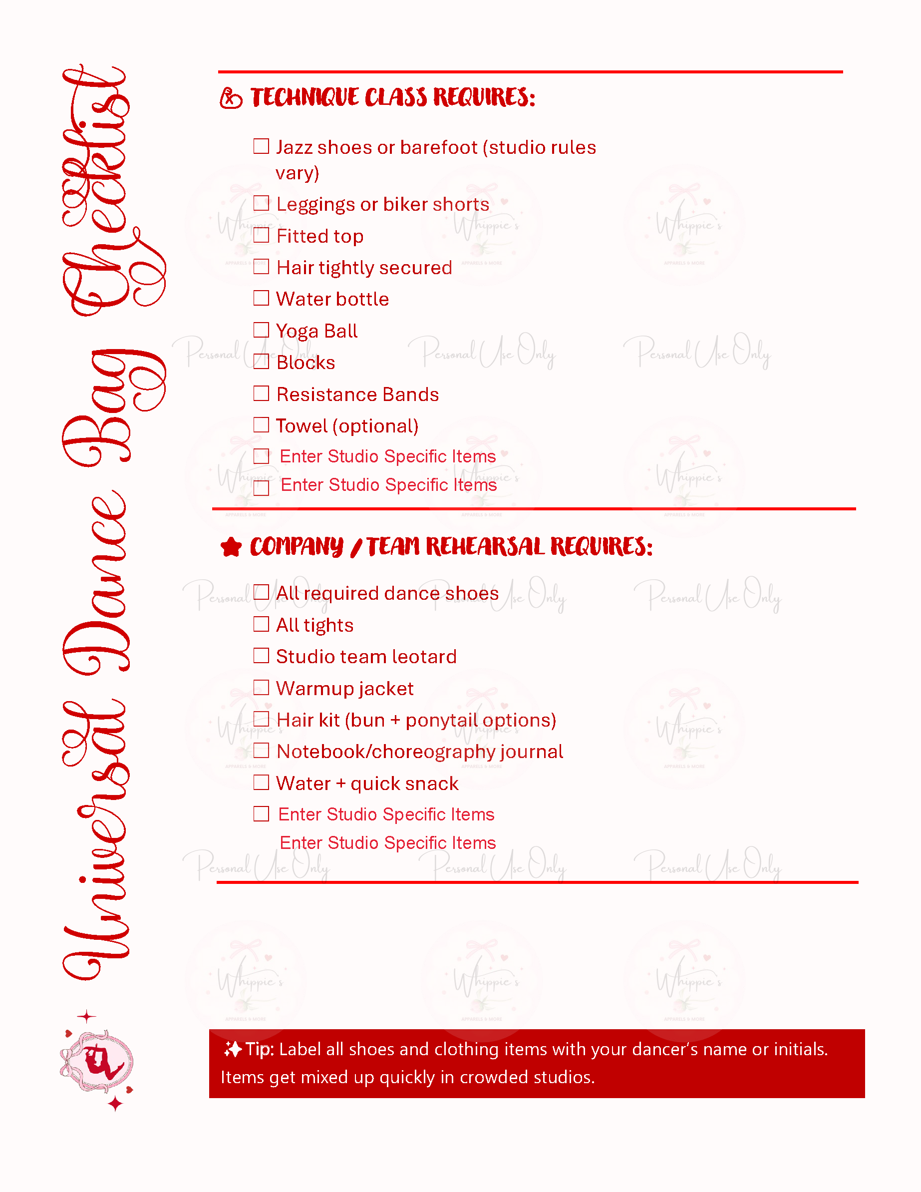 • Universal Dance Bag Checklist ensures that nothing vital is forgotten before class or rehearsal.