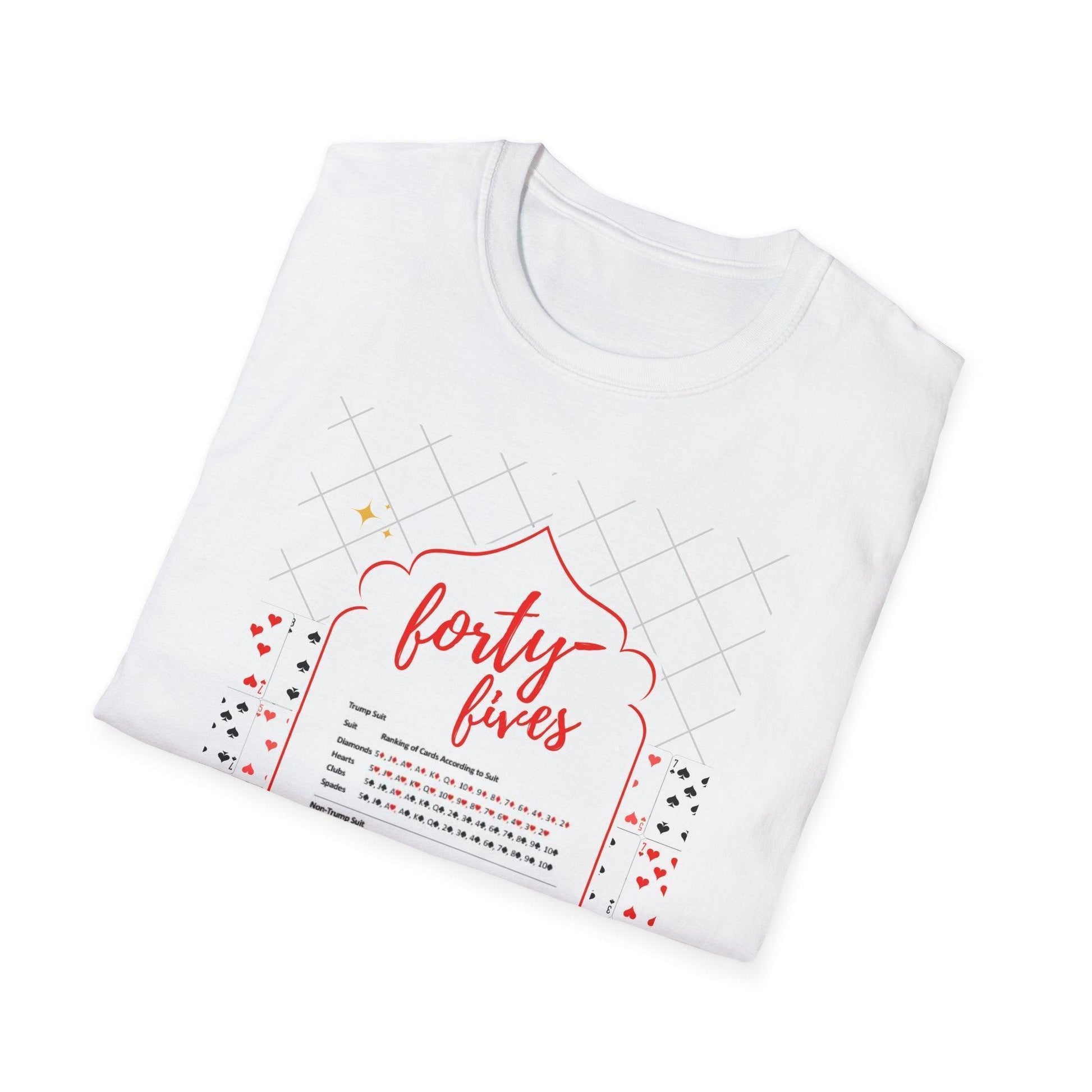 Crafted from soft, comfortable fabric, this unisex tee offers a relaxed fit that's perfect for casual wear or game night. Whether you're showing off your knowledge of the game or just enjoy the strategy of Forty-Fives, this t-shirt is a stylish and fun way to share your love for the game. Perfect for players of all skill levels!