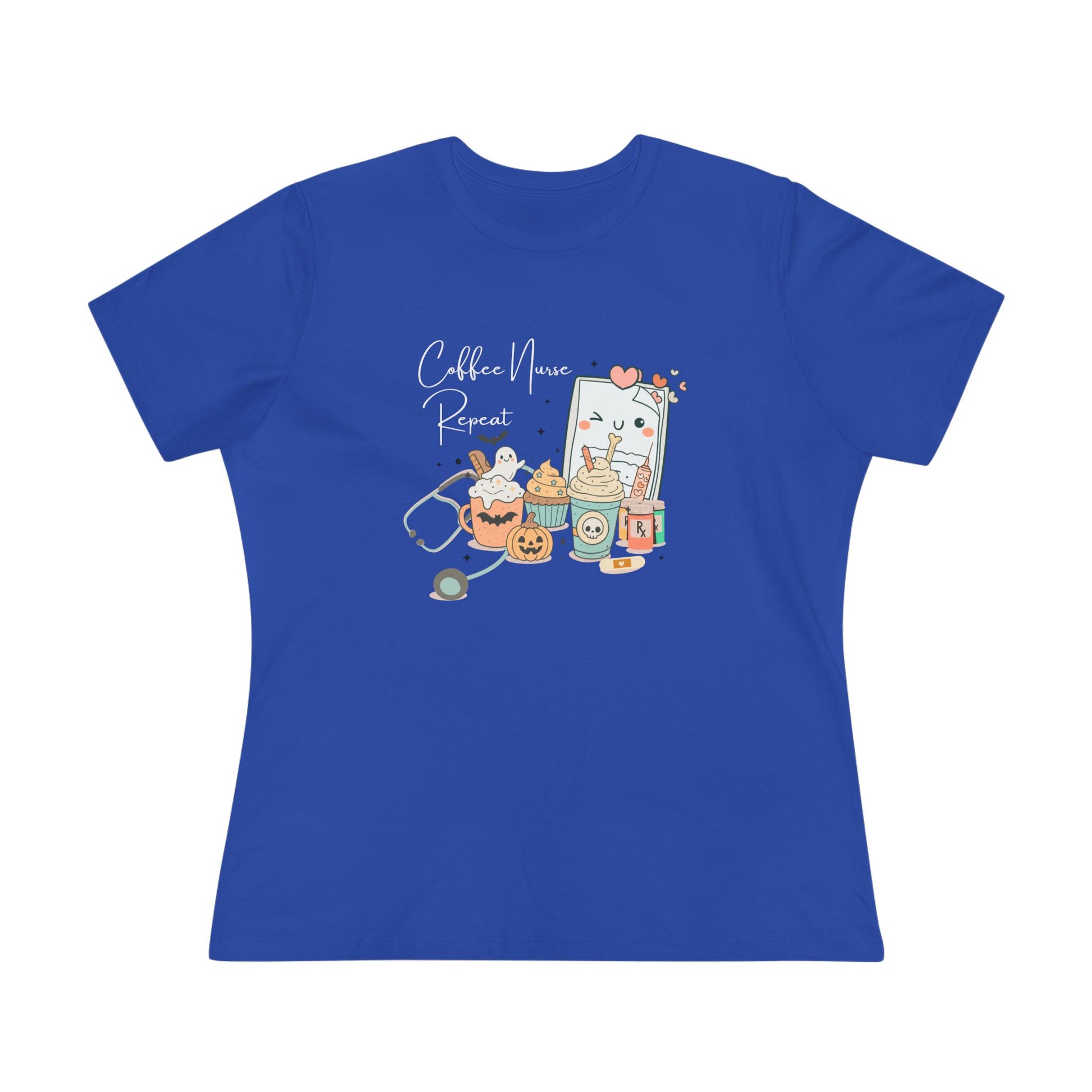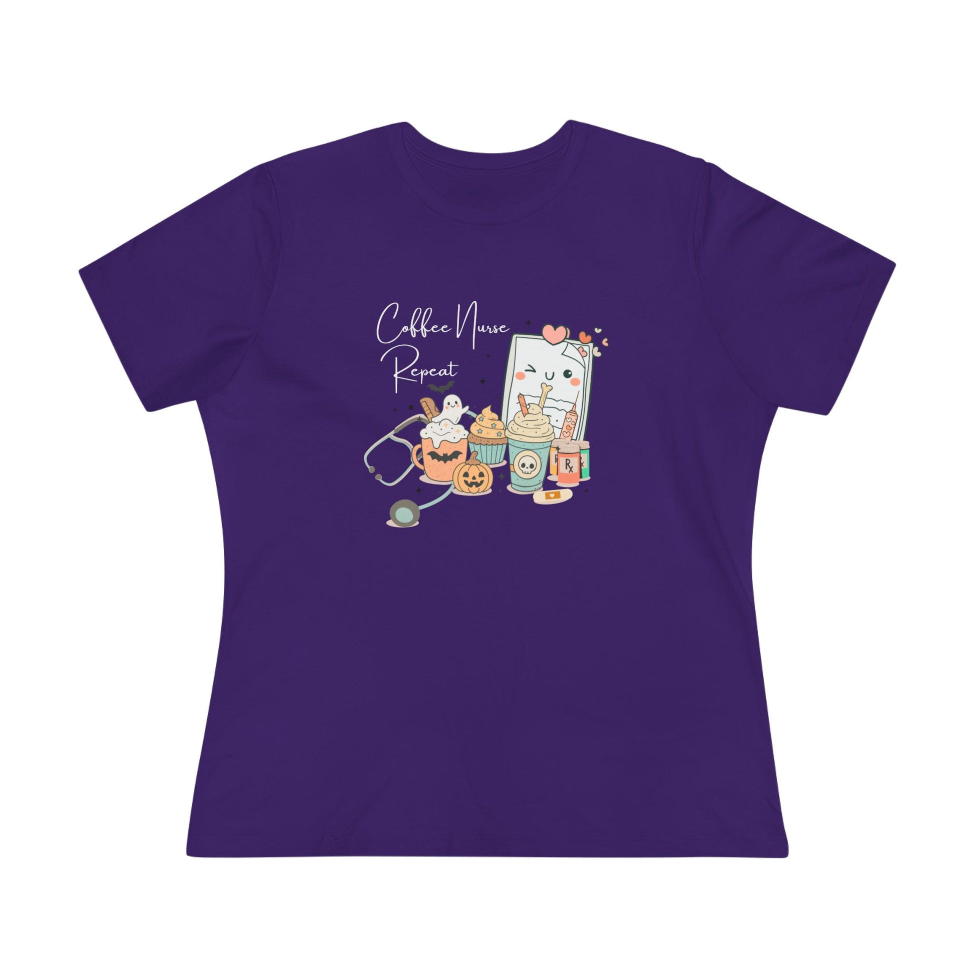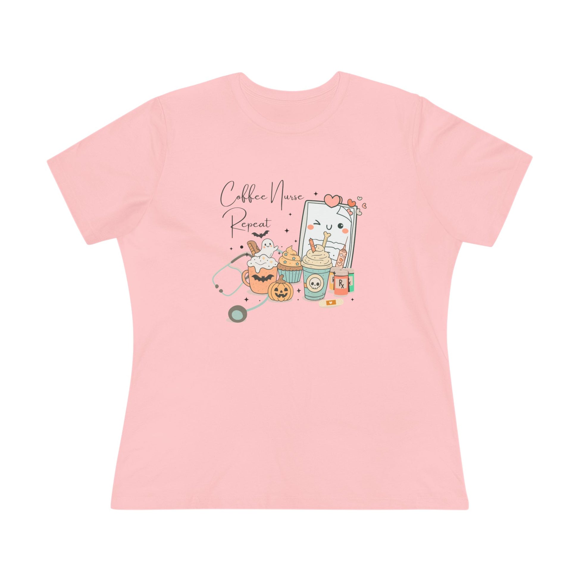 The tee features an adorable and whimsical Halloween-themed illustration that captures the essence of a busy nurse's day. You'll find a cute pumpkin mug brimming with whipped cream and a friendly ghost, a skull-adorned coffee cup, a sweet cupcake with stars, and, of course, essential nursing tools like a stethoscope, syringe, and prescription bottles – all playfully arranged around a winking "Coffee Nurse Repeat" sign. It's a charming nod to the demanding yet rewarding life of a Tired Nurse.