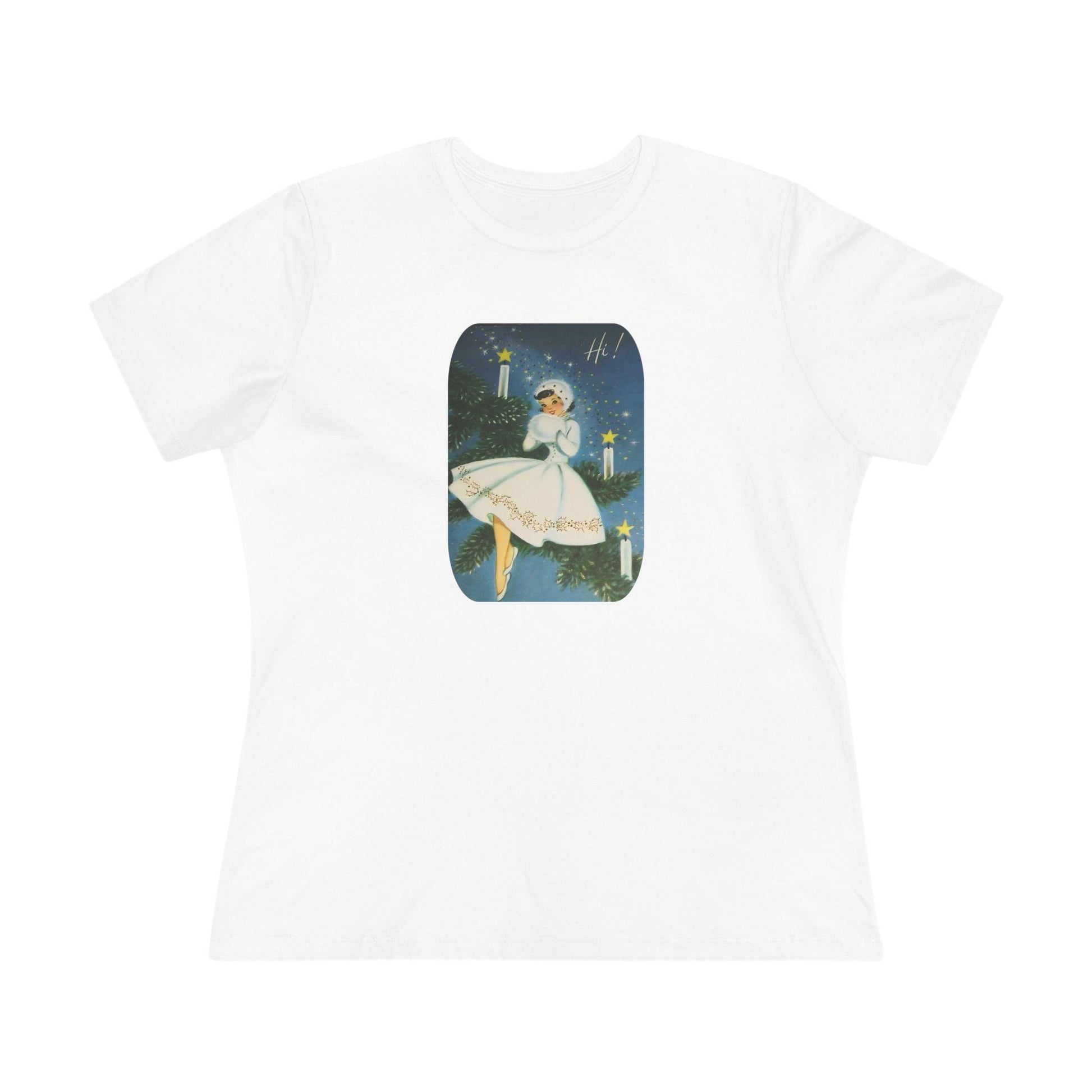 This delightful shirt transports you back to the 1950s with an enchanting illustration of a lady dressed in a pristine white ensemble, complete with a cozy muffler to keep her hands warm, saying Hi. Perched gracefully on a Christmas tree branch, she embodies the elegance and festive spirit of a bygone era.