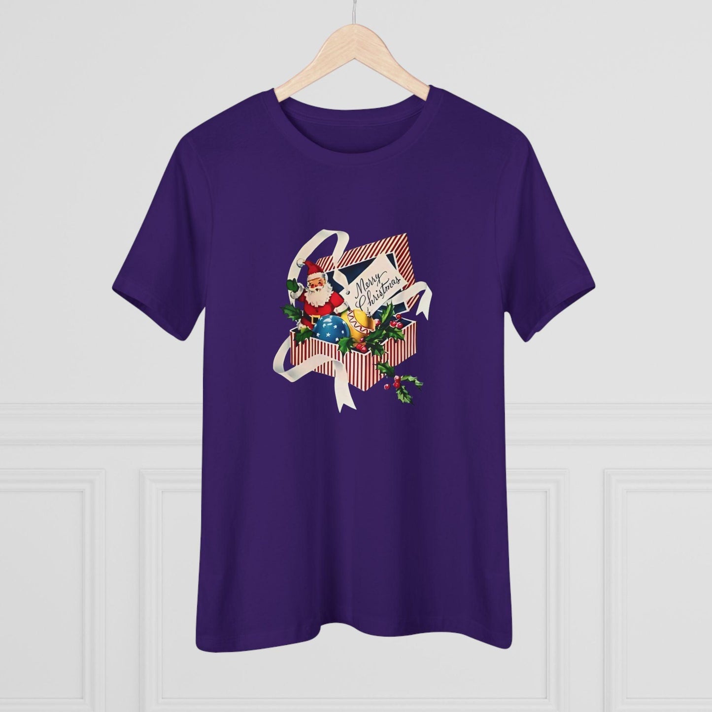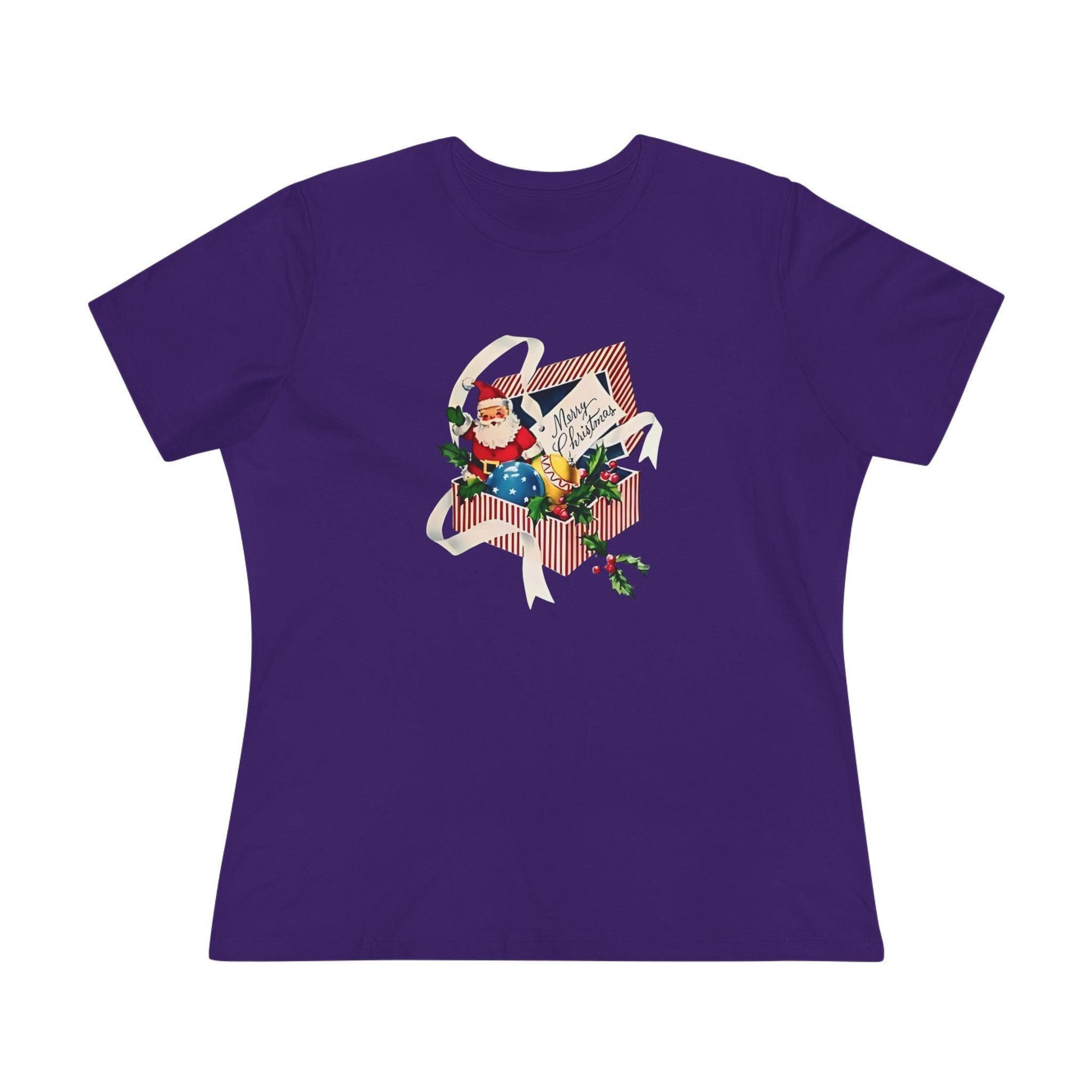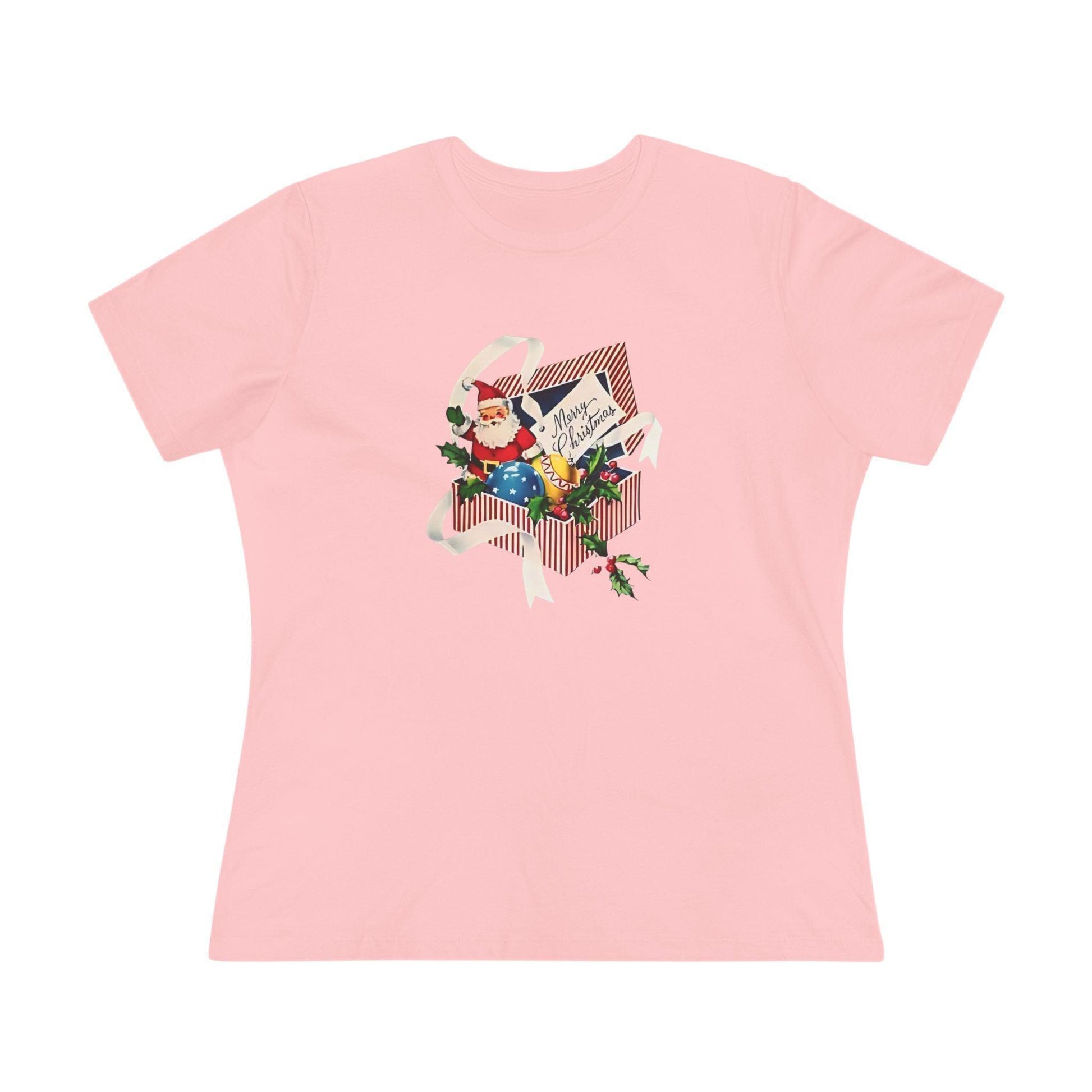 This super soft and comfy t-shirt features a vintage-inspired design with a "Merry Christmas" banner draped over a box overflowing with charming 50s-style Christmas decorations. Think Shiny Brite ornaments and an adorable Santa! Perfect for spreading holiday cheer, this tee pairs perfectly with your favorite jeans, leggings, or even a festive skirt.