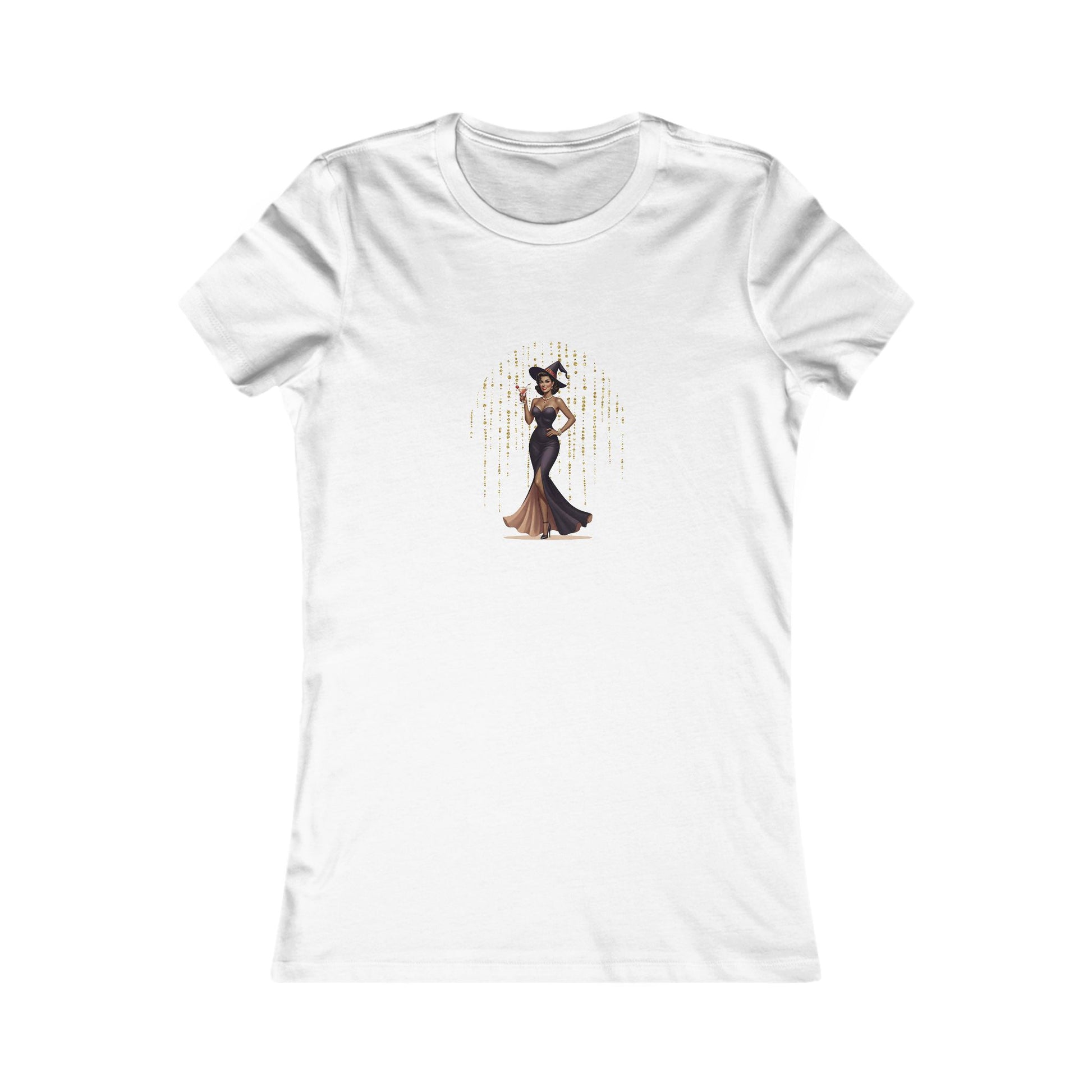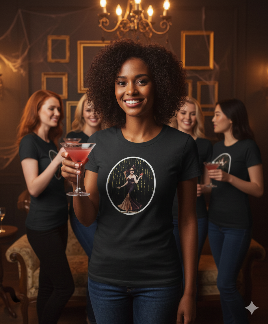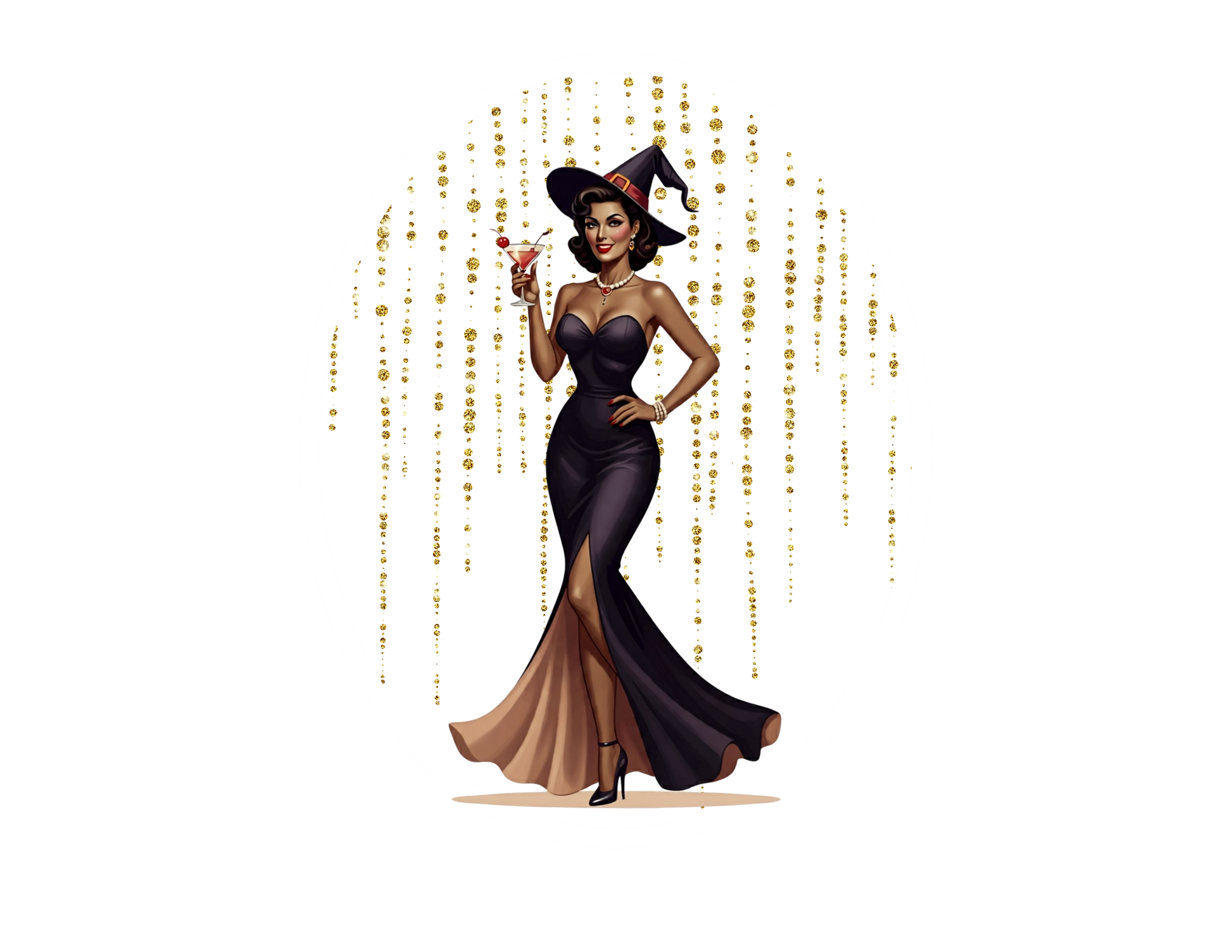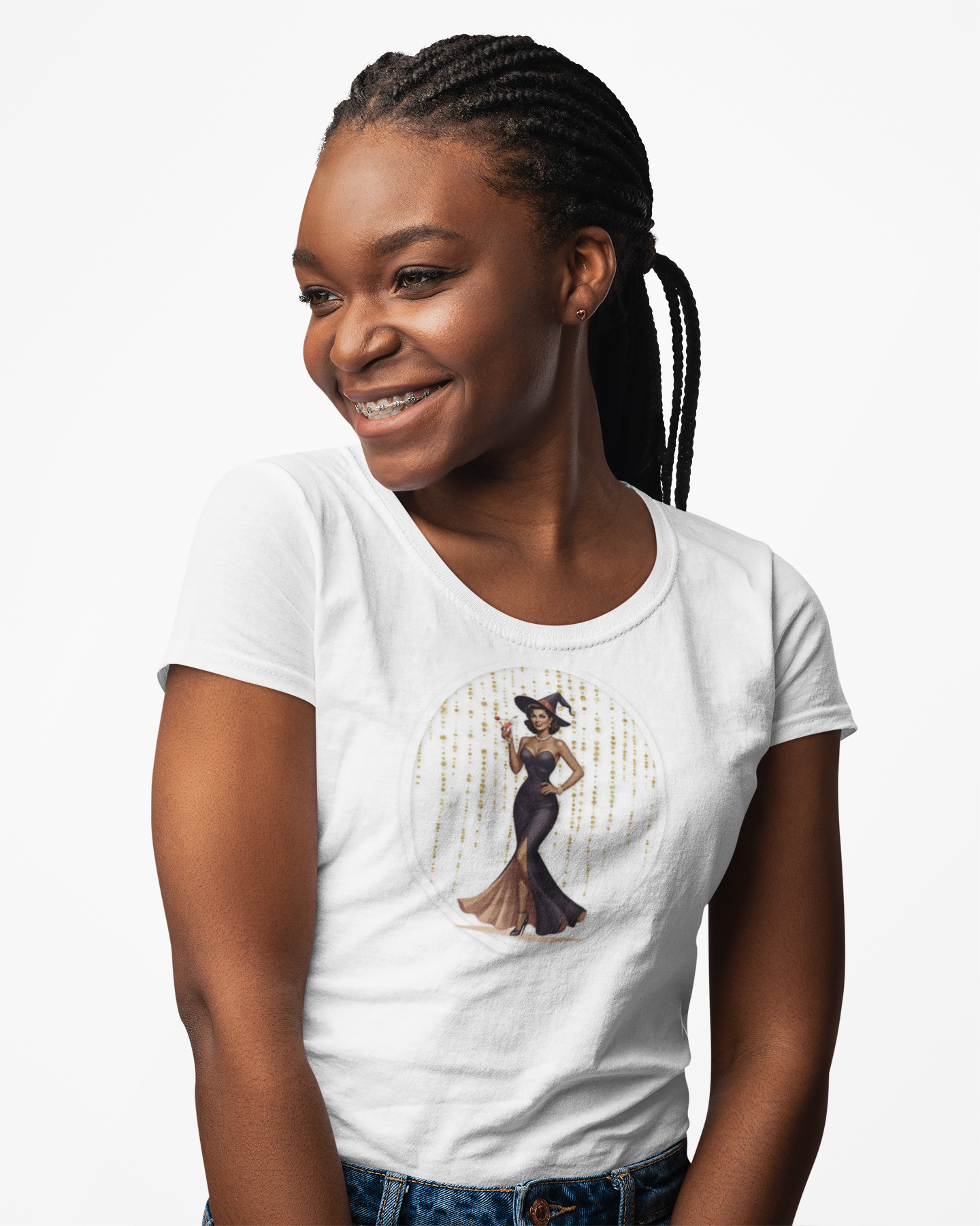 Step into the spotlight this spooky season with our "Midnight Glamour: Bewitching Pinup Halloween Tee"! This captivating t-shirt is a must-have for anyone who loves vintage charm and a touch of spooky sophistication. The tee features a stunning illustration of a gorgeous Black vixen dressed in a retro 50s pinup style. She is soaring through the night sky on a broomstick, her elegant gown flowing behind her. This design brings a unique blend of retro glamour and Halloween magic to life.