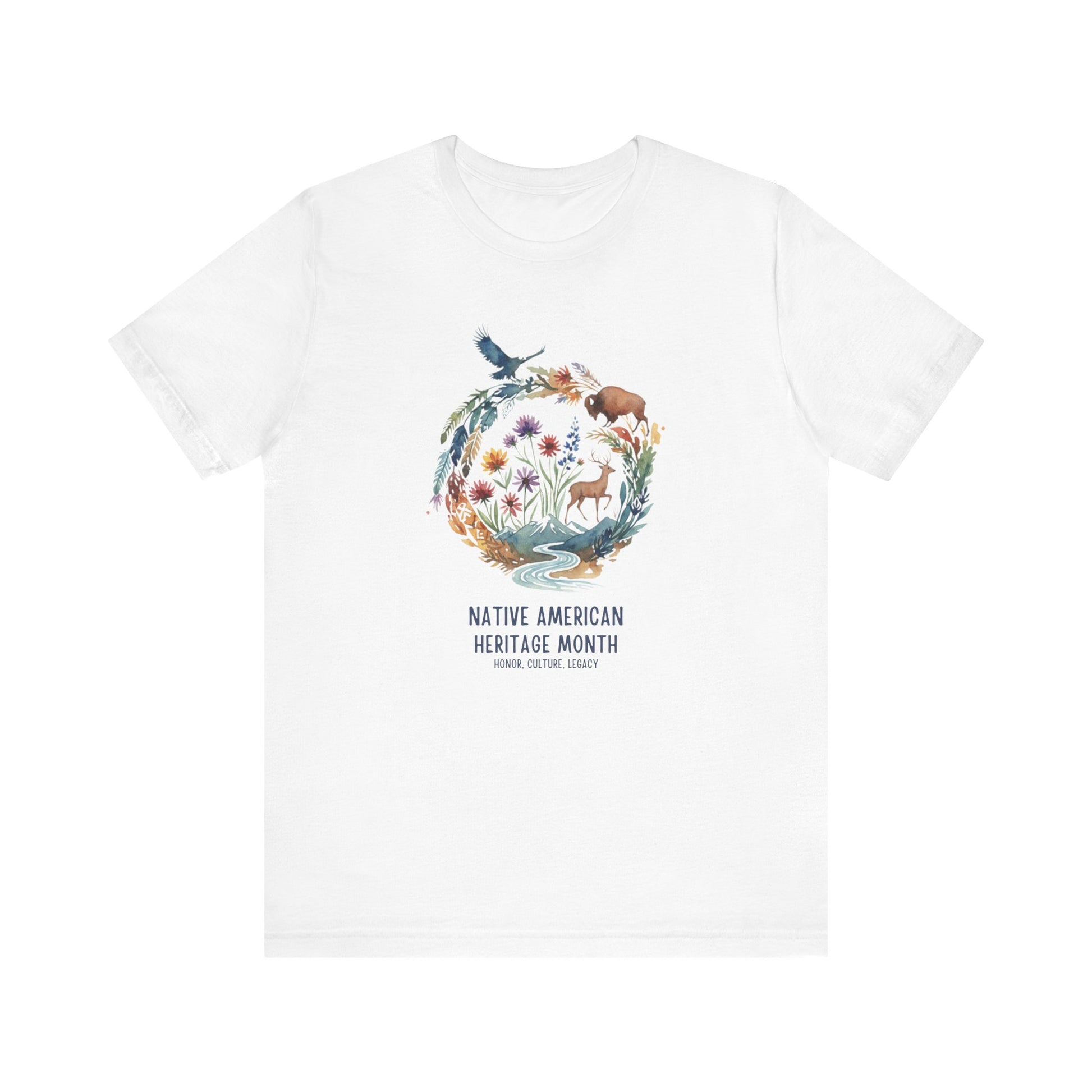 This unique watercolor design is a beautiful and respectful way to honor Native American Heritage Month every November. The central imagery features a harmonious circle of elements—a soaring raven, a majestic bison, and a peaceful deer—intertwined with native florals and natural elements like mountains and a flowing river. This artwork is a celebration of the profound connection to nature and the rich, enduring legacy of Indigenous cultures across the continent. Wearing this shirt is a meaningful gesture of respect, remembrance, and commitment to learning and honoring the diverse traditions and history of Native American peoples. It serves as a gentle conversation starter about the importance of recognition and the depth of cultural contributions made throughout history and continuing today.