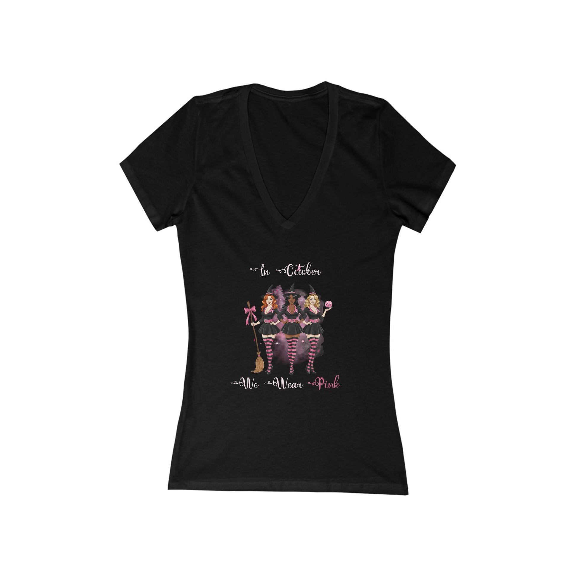 This stylish and meaningful t-shirt is the perfect way to show your support this fall. Featuring a retro 1950s pin-up illustration of three diverse, grown-up witches dressed in chic black and pink outfits, this design is a powerful statement. The graphic creatively blends the fun of Halloween with the vital message of Breast Cancer Awareness, making it the perfect piece to wear throughout October. The pin-up style illustration is detailed and vibrant, standing out beautifully on the deep V-neck tee. The witches are depicted in full-body poses, adding a touch of vintage flair to your wardrobe. Wearing this shirt is a simple yet impactful way to participate in the annual October Breast Cancer Awareness campaign and honor those affected by breast cancer.