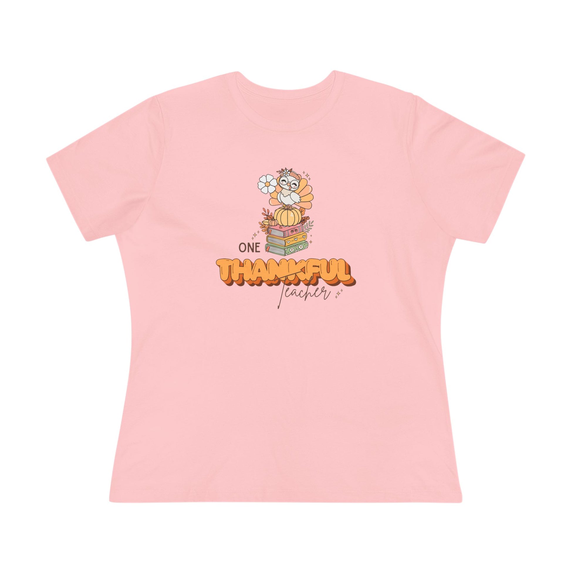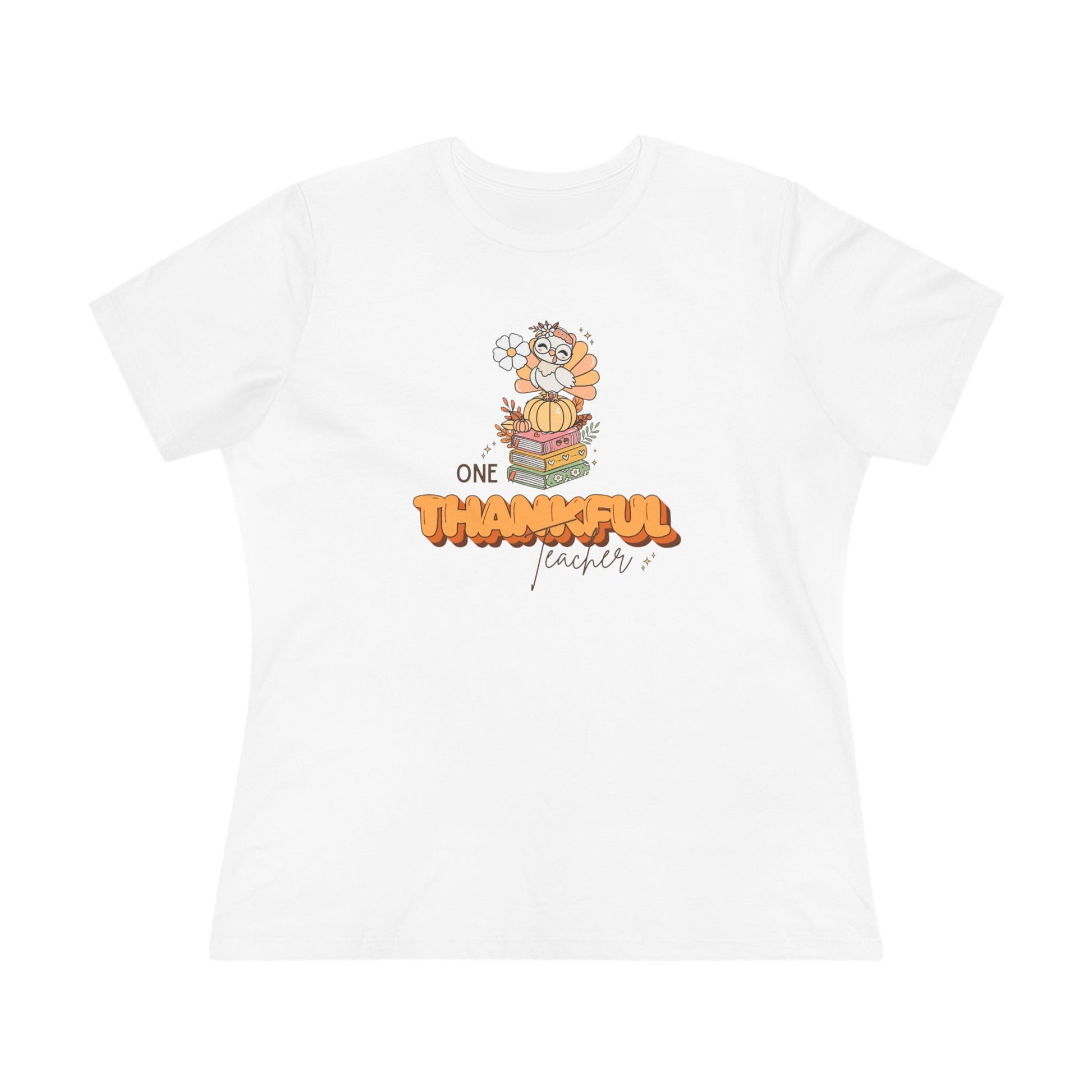• Design: Adorable "One Thankful Teacher" graphic featuring an autumnal owl/turkey character, perfect for Thanksgiving and the fall season.