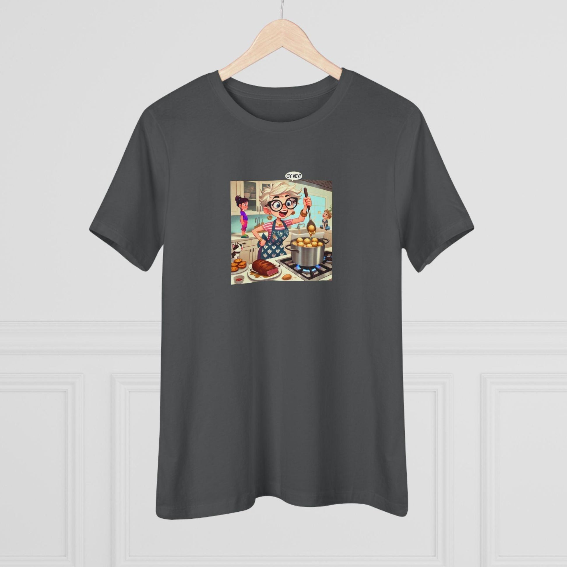This 100% ring-spun cotton women's Softstyle t-shirt features a charming and humorous design celebrating a beloved Jewish tradition. "Oy Vey!" exclaims Bubbe as she lovingly prepares her famous matzo ball soup, while in the background, her grandchildren playfully toss matzah balls to each other. This delightful scene captures the warmth and humor of family gatherings and the cherished recipes passed down through generations. With its comfortable semi-fitted silhouette, narrow rib collar, and taped neck and shoulders, this t-shirt offers both style and comfort. Perfect for everyday wear, family gatherings, or celebrating Jewish holidays, this "Oy Vey!" Bubbe tee is sure to become a favorite.