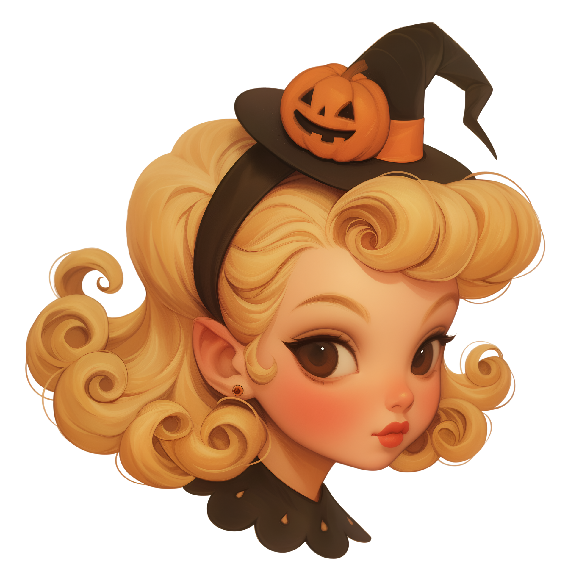 Captivating Retro Design: A beautiful blonde witch with a festive pumpkin headband. 🧙♀️🌙