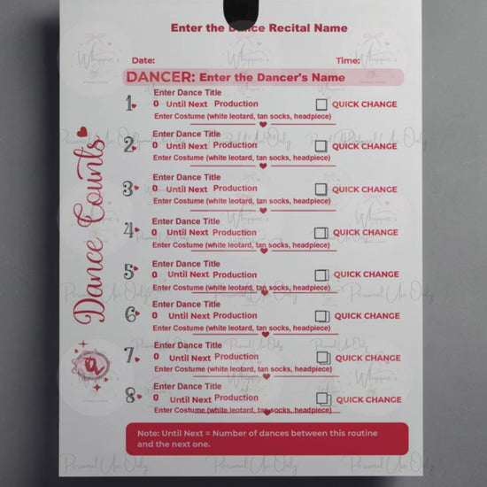 The Recital Dance Counts Tracker Printable is your backstage command center for recital day. Designed for dancers with multiple routines in one show, this tracker helps you see how many dances are between each routine, what style is coming up, and exactly what costume pieces are needed next. Instead of flipping through programs or guessing how much time you have, this sheet gives helpers, parents, and dancers a clear plan they can follow in real time.