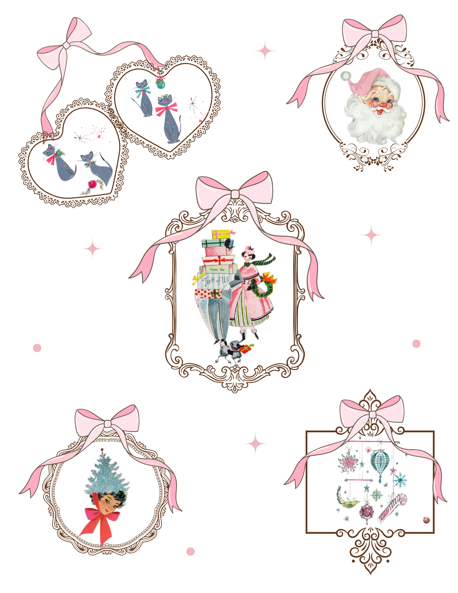 Elegant Vintage Design: The graphic features five unique, delicately framed vignettes, each capturing the essence of a charming Retro Christmas T-shirt aesthetic. Included are a sweet vintage Santa, a glamorous mid-century lady with a tower of gifts, two adorable holiday cats in heart frames, a festive Christmas tree hairdo, and a collection of delicate mid-century ornaments. Each frame is adorned with charming pink ribbons and bows.