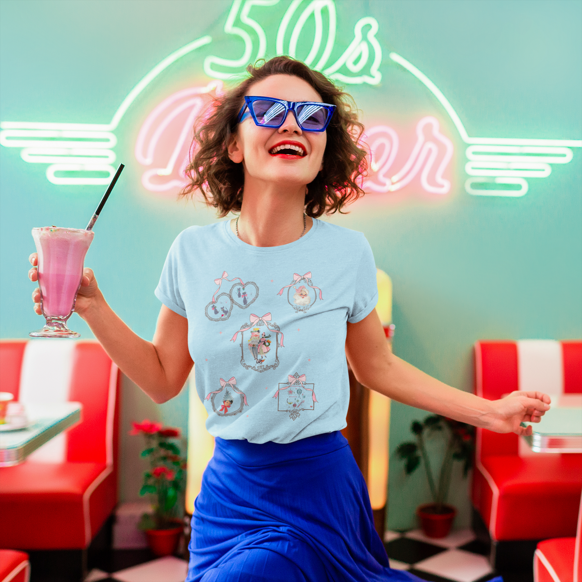 Imagine the compliments you'll receive while wearing this unique shirt, showcasing these beautiful illustrations. The detailed artwork within the lace-edged frames—the rosy-cheeked Santa with his playful wink,🎅 the fashionable lady dressed for a chilly winter’s day, and the darling cats caught up in a moment of holiday mischief 😻—all combine to create a truly enchanting visual story. The pink ribbons and subtle stars that accent the frames inject a whimsical, feminine touch that sets this Retro Christmas T-shirt apart from typical, more traditional holiday apparel. The palette of soft pinks, gentle blues, and rich browns feels both nostalgic and utterly chic. ✨