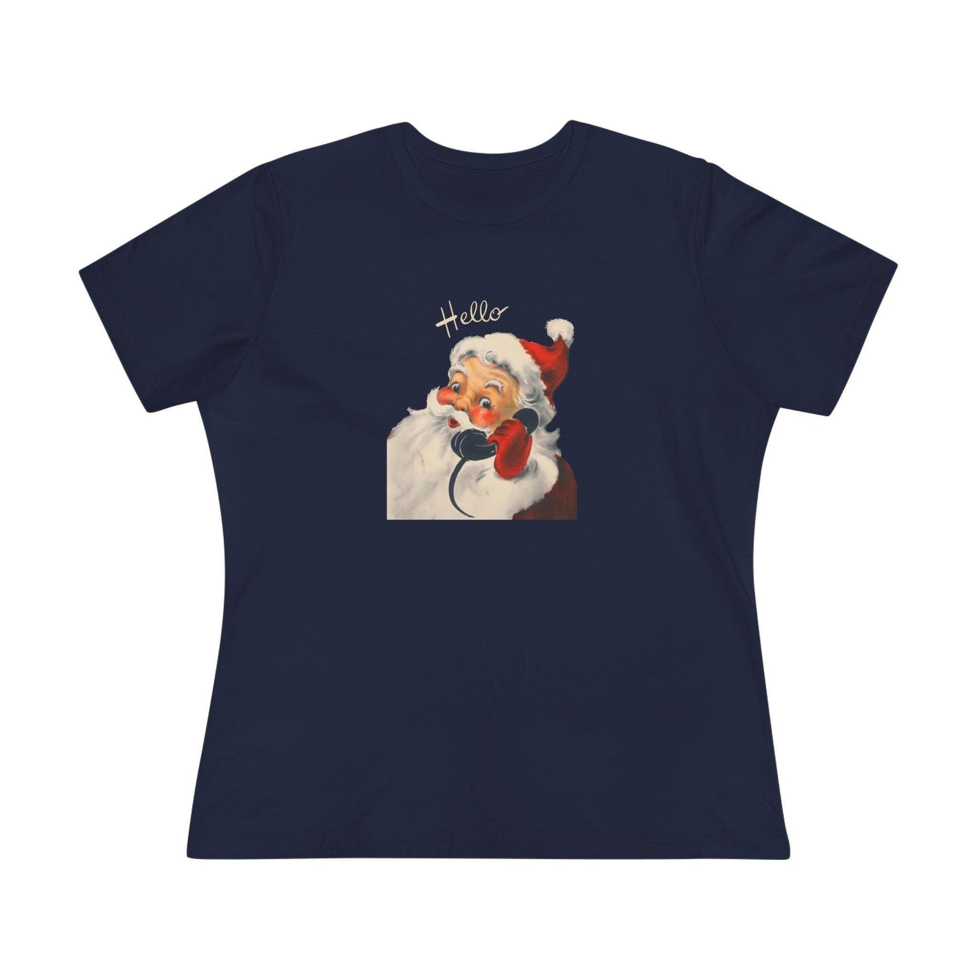 This whimsical design features a jolly Santa Claus spreading holiday cheer in a retro way! With a twinkle in his eye and a vintage phone pressed to his ear, he gives a cheerful "Hello!" This charming illustration captures the spirit of the season with a touch of vintage flair, perfect for those who appreciate classic Christmas imagery.
