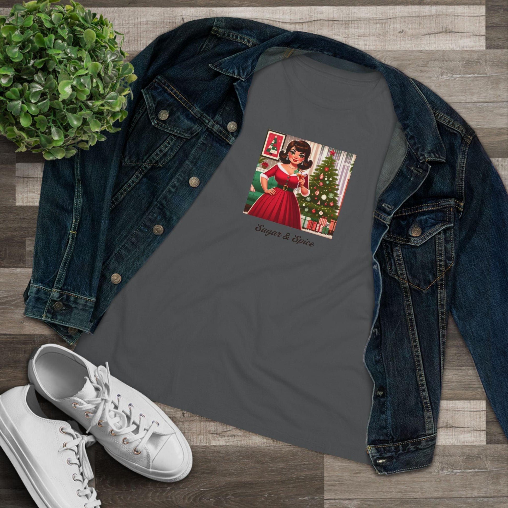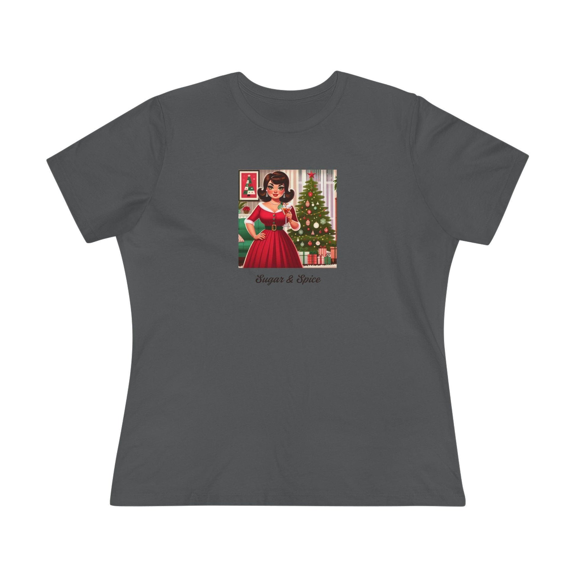 Celebrate the season with a touch of elegance and fun with our “Sugar and Spice” women’s soft tee. This stylish tee features an illustration of a brunette woman enjoying a cocktail, exuding sophistication and holiday cheer. The phrase “Sugar and Spice” adds a playful and festive touch, perfect for any holiday gathering.